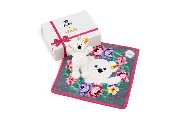 2025年はフェイラーオリジナルハンカチとシュタイフで人気のテディベア「ベン」のソフトキーリングのボックスセットが登場。